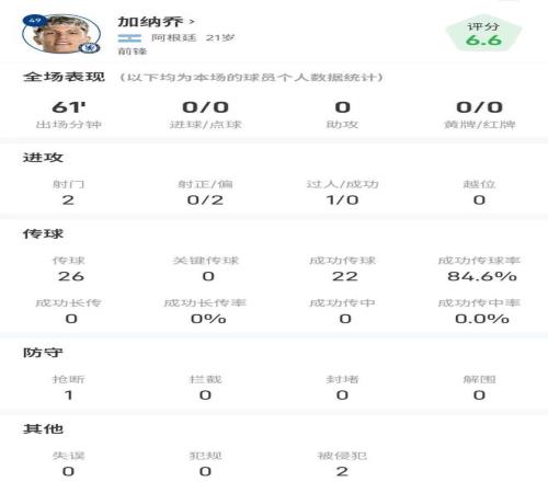 雷速体育10月1日报道宣称 欧冠联赛阶段第2轮,切尔西暂时1-0领先本菲卡,加纳乔首发出战造乌龙,在第61分钟被吉滕斯换下。
