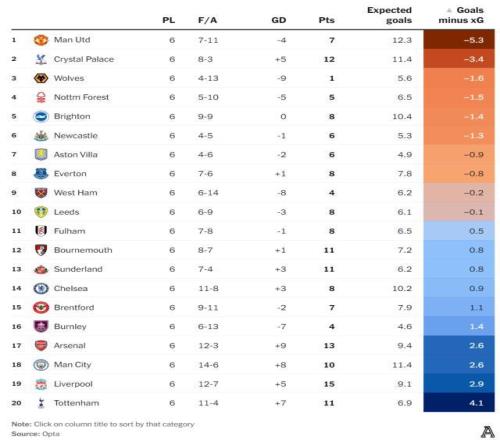 曼联的问题是,实际进球远低于预期进球,也就是说球队对于机会的把握很差,而且是英超最差:预期进球12.3,实际进球却只有7个。-5.3的差值意味着平均每场都比“合理进球数”少进了将近1个,亏空第二高的水晶宫是-3.4,其他球队都在-1.6以内。