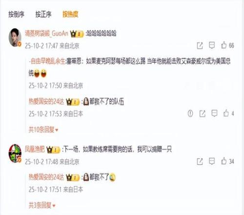 国安官微下也遭到了自己家球迷的反戈一击,两大国安著名球迷均发表了言论,“清蒸树袋熊”打了一串哈哈哈哈哈哈来发泄情绪,“凤凰鱼肥”则表示下一场,如果教练席需要狗的话,我可以捐赠一只。