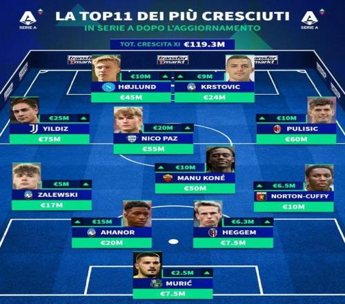 北京时间10月9日,在更新了意甲球员的身价之后,德转还列出了此次身价上涨幅度最高的11人阵容,霍伊伦、凯南-伊尔迪兹、尼科-帕斯、普利希奇、夸迪奥-科内以及扎莱夫斯基入选。