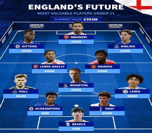 后卫:刘易斯-霍尔(纽卡斯尔联,身价3200万欧),乔希-阿昌庞(切尔西,身价800万欧),阿奇-格雷(热刺,身价3800万欧),里科-刘易斯(曼城,身价4000万欧)