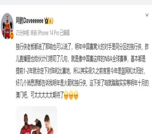 雷速体育10月13日报道宣称 根据媒体人周鹏社交媒体透露像中国赛这样的NBA全球赛事,基本是提前1-2年定下对阵和比赛地,之前官宣今年是篮网和太阳时,好几个消息源都告诉他明年是火箭和独行侠。