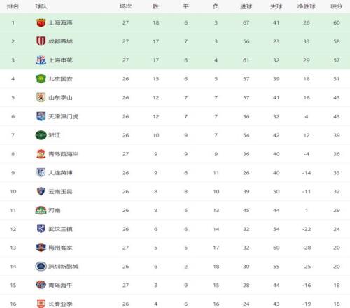 本轮比赛,三队同时取胜,积分榜前三排名仍差3分,具体为上海海港积60分、成都蓉城积58分、上海申花积57分。