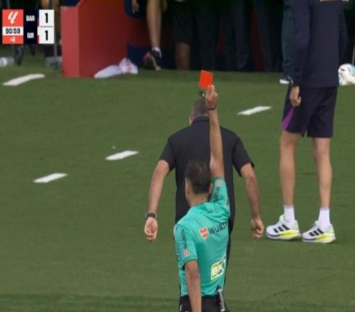 进入下半场,巴萨持续给对手施压。第51分钟,费尔明射门,皮球打在立柱上。第70分钟,拉什福德在禁区里被放倒,但裁判没有表示。第91分钟,场上出现意外,弗里克因抗议裁判,被出示红牌罚出场外。