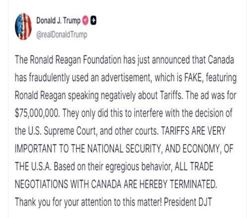 特朗普通过社交媒体表示,美国终止与加拿大的所有贸易谈判。