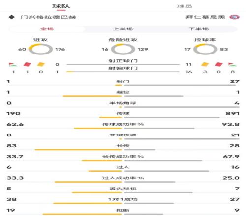 雷速体育10月25日报道宣称 今晚刚刚结束的德甲第九轮的一场焦点战,门兴格拉德巴赫主场迎战拜仁慕尼黑。上半场双方均无建树,下半场基米希帮助拜仁打破僵局,随后格雷罗和卡尔又连下两城,最终拜仁3-0完胜门兴,迎来开赛季各项赛事13连胜。