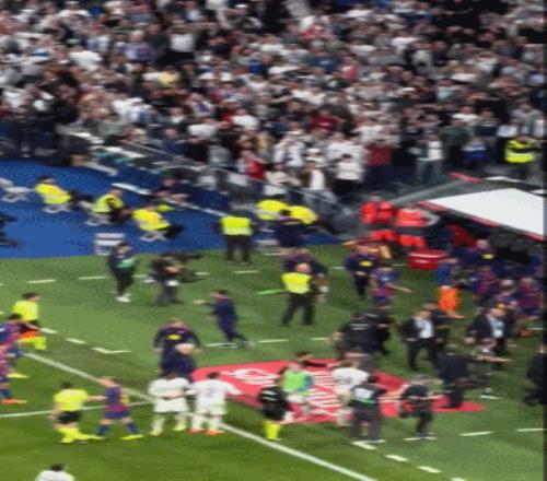 比赛进入伤停补时阶段,胜负已定,皇马主场伯纳乌的看台上响起了熟悉的敌意口号:“Puta Barça!”(“巴萨XX!”)——这句粗俗的喊声长期以来被视为国家德比中皇马球迷表达敌意的“传统”。