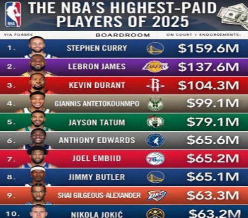 摊开这份新公布的福布斯2025年NBA球员排行榜单,前十人分别是库里、詹姆斯、杜兰特、字母哥、塔图姆、爱德华兹、恩比德、巴特勒、亚历山大、约基奇;从这份名单来看,这几乎就是目前NBA时代的顶流版图了。只是最被关注的,还是榜首位置终于换人了。