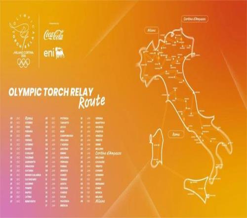 11月26日,奥运圣火将在希腊奥林匹亚古奥运遗址点燃。随后,圣火将在希腊境内进行传统仪式性传递,并于12月4日在雅典的交接仪式上正式移交给意大利代表团。随后圣火将在12月6日从首都罗马正式出发,开启在意大利境内的传递。