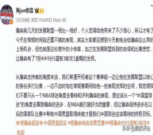 媒体人“海jun的蓝”发文点评:瀚森前几天的发展联盟一场比一场好,个人觉得给他带来了不少信心,所以才有了今天在常规时间段还算不错的表现,其实大家都没想到今天教练会给瀚森这么早的上场机会,但也就是这份意外的小惊喜,加之在发展联盟找到的自信和比赛感觉,让瀚森有了7投4中9分5篮板3助攻1盖帽的发挥。