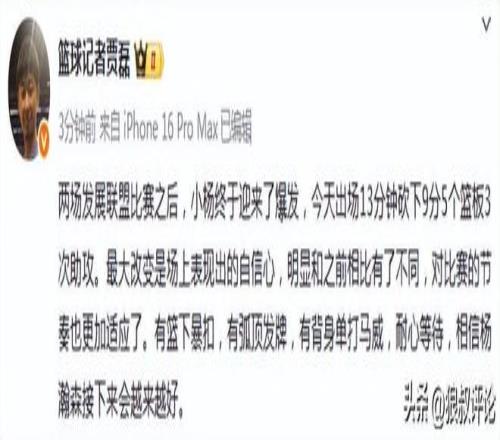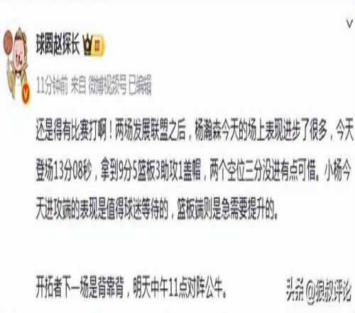 媒体人“赵探长”发文点评:还是得有比赛打啊!两场发展联盟之后,杨瀚森今天的场上表现进步了很多,今天登场13分08秒,拿到9分5篮板3助攻1盖帽,两个空位三分没进有点可惜。小杨今天进攻端的表现是值得球迷等待的,篮板端则是急需要提升的。