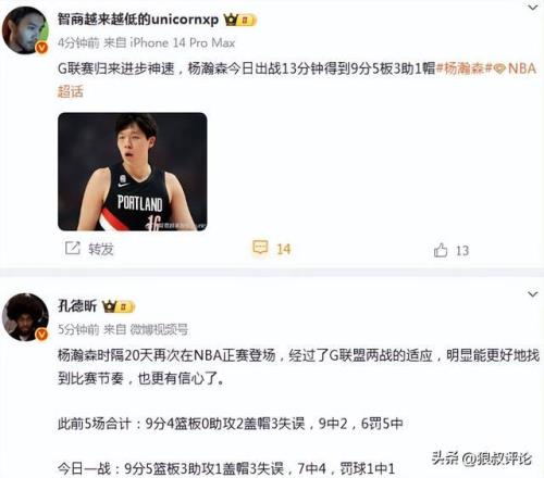 篮球评论员徐静雨发文点评:杨瀚森9分5篮板3助攻1盖帽,这一战是他进入开拓者轮换的立身之战,此战过后估计会确定自己的队内位置,不会再被轻易下放g联赛了。