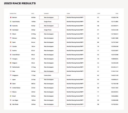 红牛车队的维斯塔潘在 2023 年以压倒性优势赢下了当年的绝大多数比赛