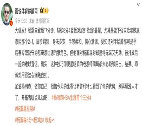 评论员徐静雨辣评杨瀚森表现:“篮下强攻哈尔滕施泰因那个2+1,脚步娴熟、身法多变,手感柔和、信心满满,要知道对手哈腾那可是季后赛专职防守约基奇恩比德的狠角色,但他面对杨瀚森时却显得无奈又无助,被打成后一脸的难以置信。相信今天的比赛让斯普利特也看到了你的优势,别再埋没人才了,开拓者听点儿劝吧!”