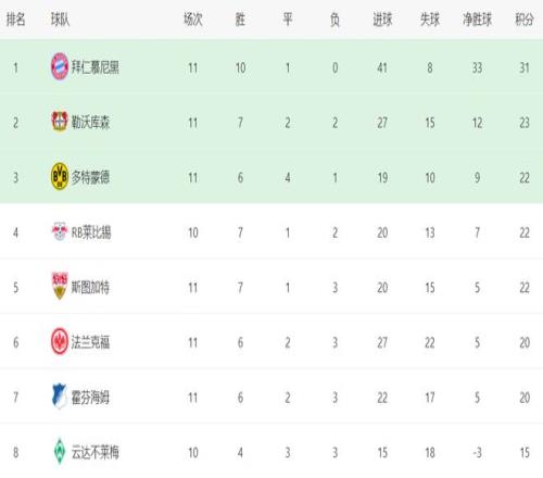 在积分榜上,拜仁牢牢占据榜首位置。拜仁10胜1平保持不败,拿到了31分。勒沃库森赢球之后,总积分达到23分,超越了多特蒙德,升到第2名,但与拜仁的差距依然很大,足足落后8分。多特蒙德以22分排名第3。莱比锡和斯图加特也是22分,排名第4和第5。法兰克福和霍芬海姆都是20分,排名第6和第7。不莱梅以15分排名第8。