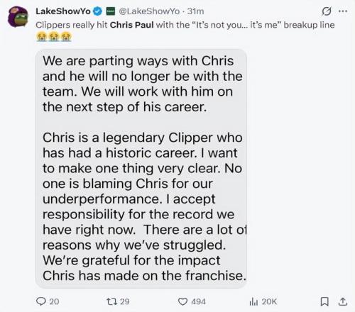 快船队总裁劳伦斯-弗兰克在TA的声明中写道:克里斯是一位传奇的快船球员,他有一个非凡的生涯。我必须明确一点:没有人将球队目前成绩不好归咎于他。对于球队当前的战绩,我承担全部责任。