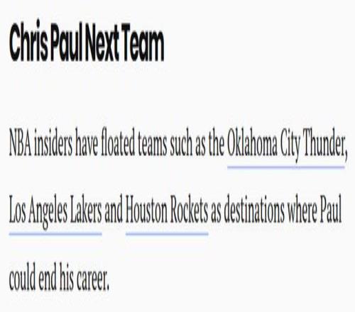 NBA圈内人士已列出多支可能成为保罗生涯终点站的球队,包括俄克拉荷马城雷霆、洛杉矶湖人和休斯顿火箭。