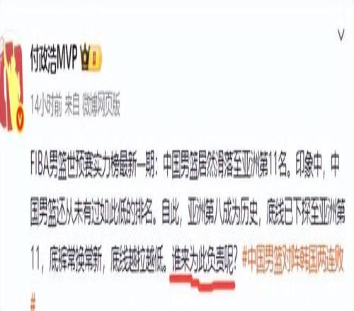 如今中国男篮在FIBA男篮世预赛实力榜中,已滑落至亚洲第11名。中国男篮还从未有过如此低的排名。自此,亚洲第八成为历史。付政浩责问:谁来为此负责?事到如今,不能为了一人之尊荣而置中国篮球大局于不顾了。付政浩呼吁郭指导主动让贤,转而继续在国家队当助教。他希望中国篮协及时止损,不能再冒险了,容错空间已经严重不足,请尽快换帅!诸位,你支持付政浩发声吗?