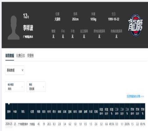如今,回到广州男篮,李祥波随队打了2场俱乐部杯赛的比赛。结果呢,12月3日对阵山西队,他打了11分钟,4投1中,拿到2分3篮板1助攻。12月5日对阵广东队,他打了25分钟,3投0中,靠罚球拿到2分1篮板3助攻1盖帽。