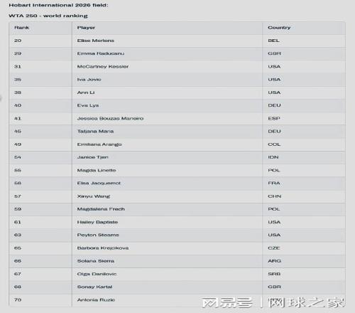 我们再来关注赛事消息。北京时间今晨,WTA250霍巴特站公布了最新的参赛阵容。 比利时名将梅尔滕斯领衔出战,英国一姐拉杜卡努、捷克名将克雷吉茨科娃、美国新星约维奇、李吉妮、德国美女利斯等球员都将参赛。中国二姐王欣瑜的名字也出现在参赛阵容当中。本站赛事的卫冕冠军是美国人凯斯勒,比赛将于明年1月12日--17日进行。