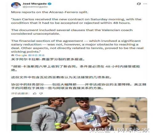 一位名为“TennisForever”的网友写道:“家庭和商业已经介入太多。阿尔卡拉斯需要的是专注于网球的人,而不是利用他名声的人。也许分手对双方都好。”