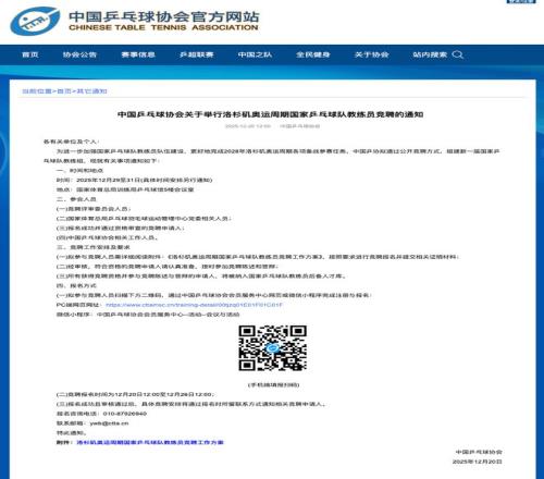 12月20日,中国乒乓球协会发布关于举行洛杉矶奥运周期国家乒乓球队教练员竞聘的通知。通知提到,为进一步加强国家乒乓球队教练员队伍建设,更好地完成2028年洛杉矶奥运周期各项备战参赛任务,中国乒协拟通过公开竞聘方式,组建新一届国家乒乓球队教练组。