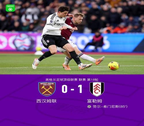 北京时间12月27日,英格兰足球超级联赛第18轮,西汉姆联坐镇主场迎战富勒姆。比赛中,斯卡莱斯解围踢空,哈里-威尔逊助攻劳尔-希门尼斯头槌绝杀。凭借此球,富勒姆客场1比0战胜西汉姆联。