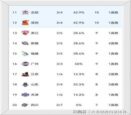 榜尾方面,7连败的四川男篮倒数第一,6负1胜的天津队和2胜4负的山东队倒数二三。