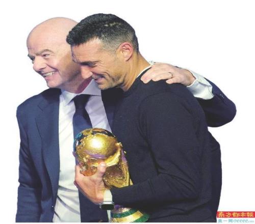 12月6日,美加墨世界杯抽签仪式现场,阿根廷队主教练斯卡洛尼(左)送还大力神杯。