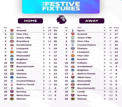 榜单中最引人注目的反差来自托特纳姆热刺。他们在主场表现挣扎,9场比赛仅取得8分,排名倒数第四;然而在客场,热刺却脱胎换骨,以17分高居客场积分榜首位。