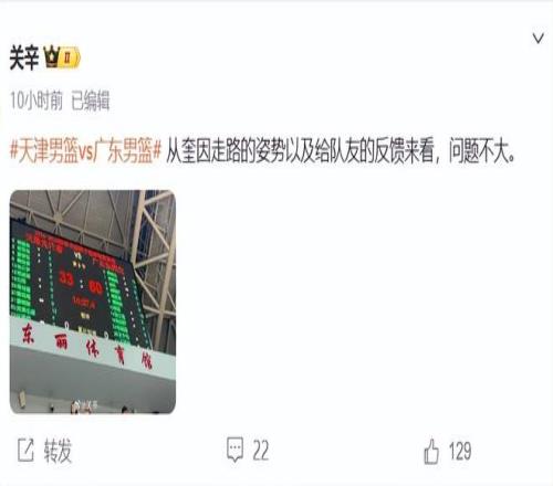 再从跟队记者关辛的报道来看,中场休息阶段,关辛拍了一段奎因练习投篮的视频,从画面中看,奎因的走路姿势还是比较正常的。