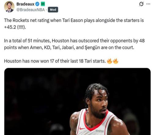 这也是其进入首发后整体傲人表现的缩影,当伊森搭档首发阵容时,火箭队净胜率为恐怖的+45.2,即每百回合火箭队净胜对手45.2分之多。