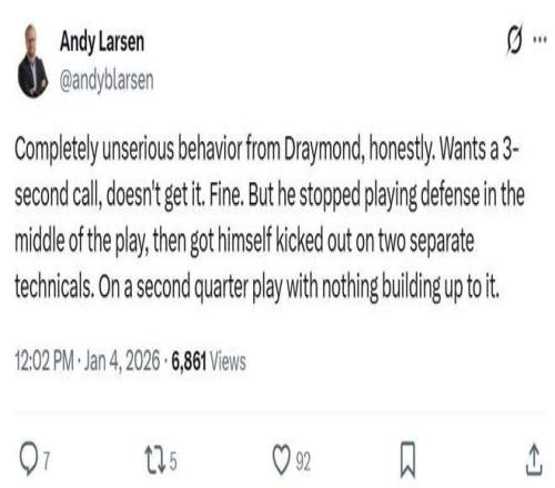 面对追梦这样的表现,爵士记者Andy Larsen公开发文批评道:“追梦的行为完全不负责任,实话实说,他想得到一个三秒违例的判罚,但没有得到,结果他就在比赛进行的情况下,直接放弃防守怒喷裁判,然后直接被罚出场,这一幕发生在第二节,还是在此前没有任何铺垫的情况下。”