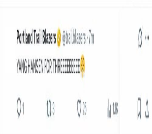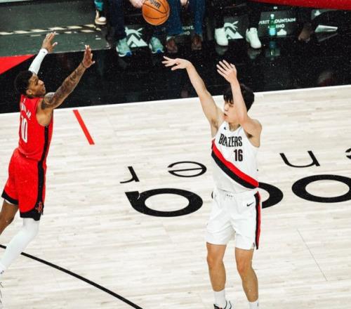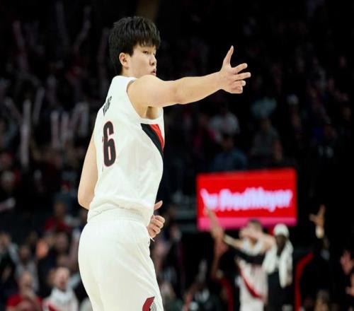 开拓者官方庆祝杨瀚森命中三分球。