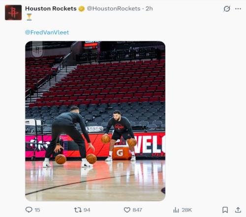 范弗利特已经开始在场边进行一些球类训练,此前火箭记者凯利-伊科透露范弗利特可能会在常规赛末尾复出。