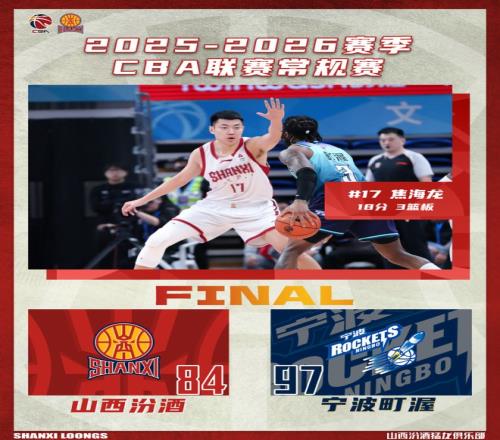 北京时间2026年1月13日19:35,2025-2026赛季CBA联赛常规赛第14轮继续进行,山西汾酒客场挑战宁波町渥。两队历史上共交手9次,山西汾酒8胜1负;本赛季两队交手1次,山西汾酒1胜0负。本场比赛,山西队开局慢热,进攻端处理球不够耐心,导致命中率偏低,末节追分时刻,对重点人的限制做得不够好,最终落败。全队今晚的表现不够积极主动,缺乏斗志,需摆正心态,尽快调整。全场比赛结束,山西汾酒84:97不敌宁波町渥。