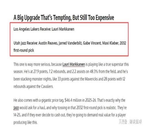 所以美媒认为如果难以留住里夫斯,或者给他开出续约合同,具备较大风险的话,倒不如把里夫斯送走,换来其他靠谱明星球员。于是美媒支招湖人,可以从爵士交易来当打球星马尔卡宁,里夫斯成为主要筹码,并且湖人还要送出三将文森特、克勒贝尔、范德比尔特再加上一个来自2032年的首轮签。