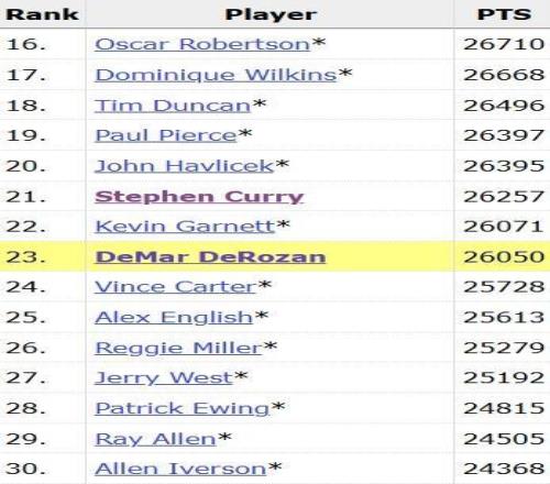 目前排在德罗赞身前的是库里,两人均为现役。在第20位为绿军名宿哈弗里切克,德罗赞还落后他300多分。