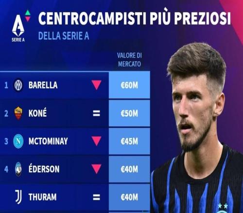 北京时间12月27日,德转列出了球员身价更新之后,意甲中场身价TOP10,巴雷拉6000万欧元排名第一,夸迪奥-科内5000万欧元第二,麦克托米奈4500万欧元第三。德转列意甲中场身价前10:1.