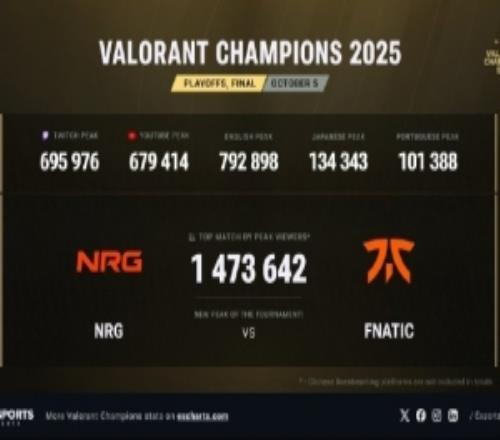 体育资讯10月8日报道宣称 据国外Esports Charts数据网站统计,瓦罗兰特巴黎全球总决赛的峰值观众为147w,不及CS2 Major和英雄联盟MSI。 CS2的上