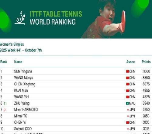 10月7日,国际乒联公布2025年第41周世界排名。男单方面,王楚钦凭借在WTT中国大满贯中夺冠,世界排名积分从9425分跃升至10900分。女单方面,“万分女王”孙颖莎继续领跑世界排名,连