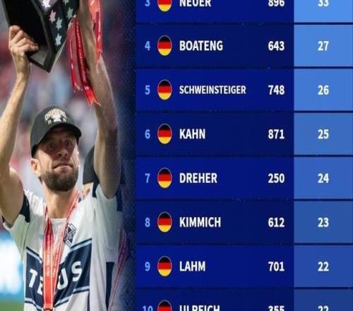 在跟随温哥华白浪夺得加拿大冠军联盟冠军后,托马斯-穆勒职业生涯已夺得35座冠军,这使得他超过托尼-克罗斯,成为夺冠次数最多的德国球员。德国球员夺冠次数排行榜1 托马斯-穆勒